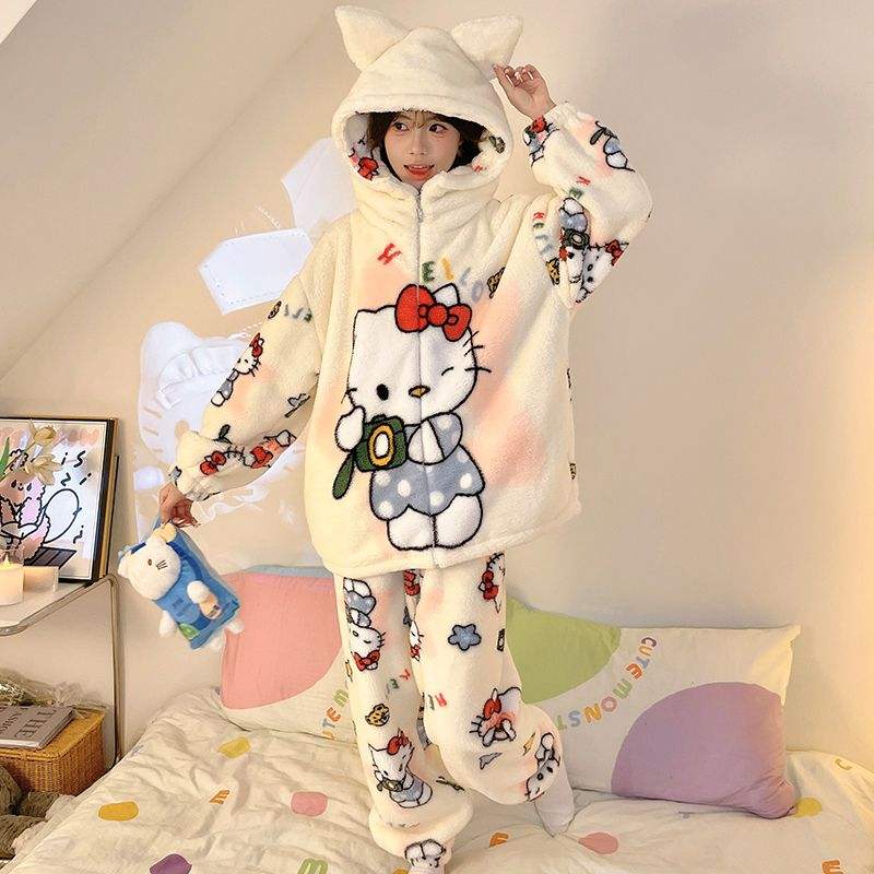 New Winter Women's Pajamas with Thickened Plush and Cute Cartoon Zipper Hooded Flannel Home Suit Set