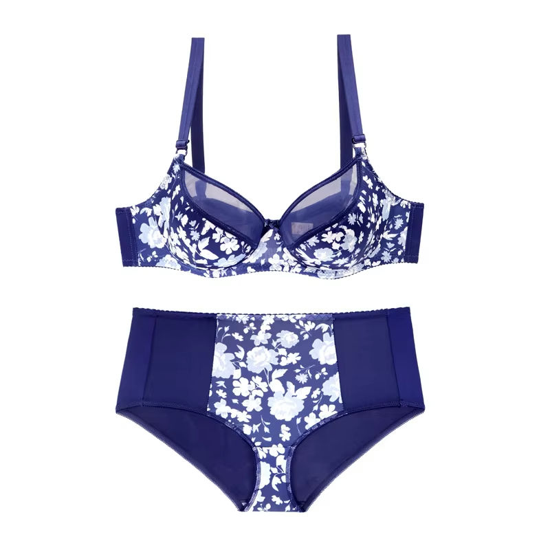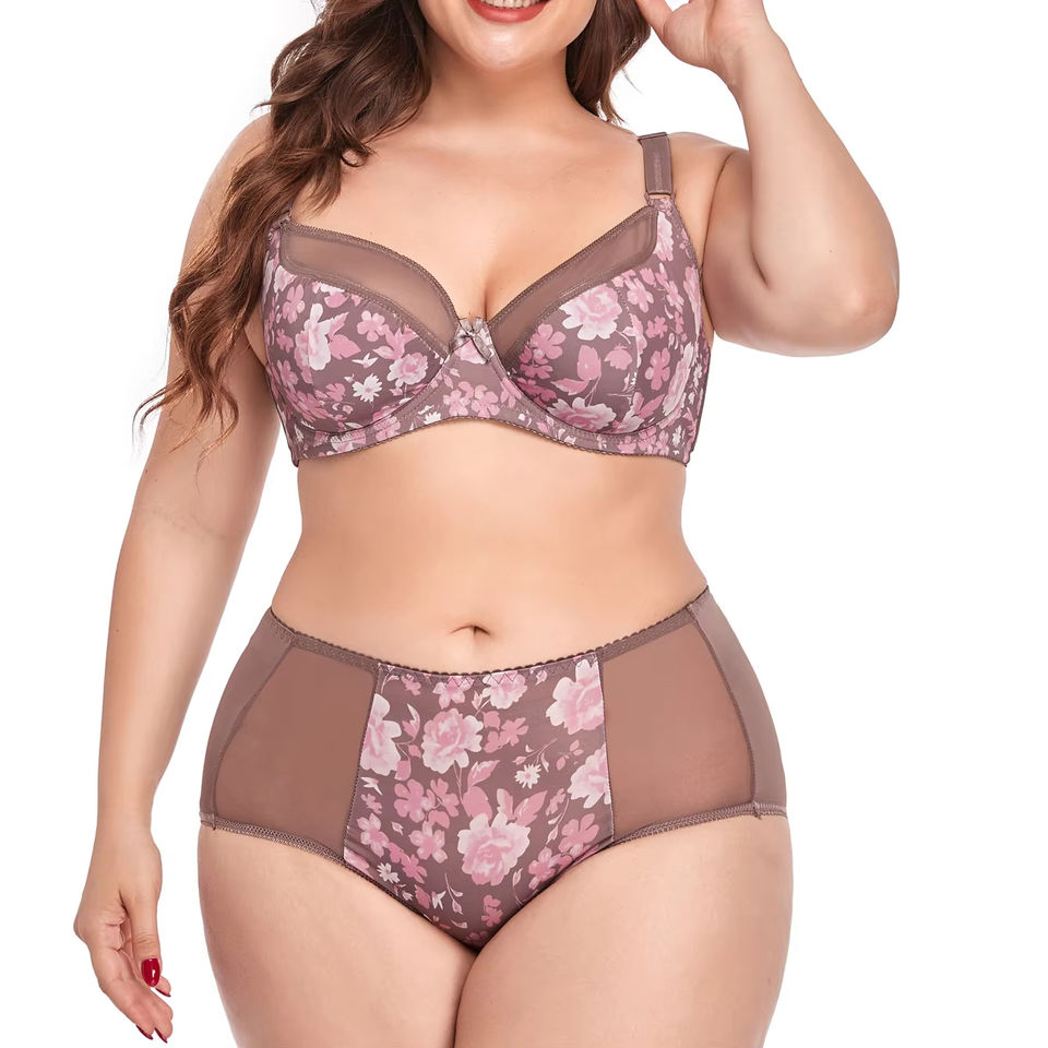 New Women Underwear Plus Size Bra Set and Panties Push up Underwire Printed Bra Ultra-Thin Full Cover Cup Large Bra