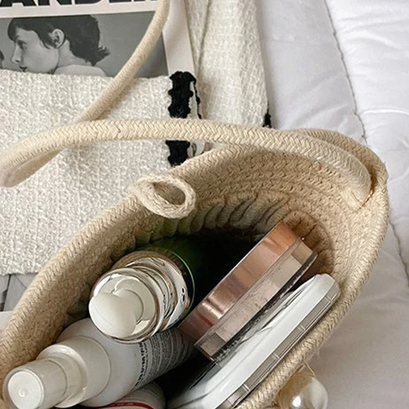 New Women's Large Capacity Woven Bucket Bag French Casual Cotton Rope Handbag with Pearl Decoration Single Strap Tote Bag