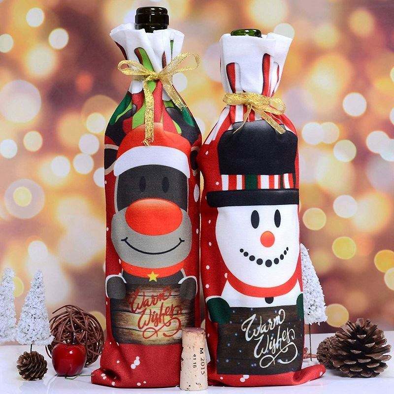 Decorazioni per la Tavola Natalizia con Set di Bottiglie di Vino Stampate con Cartoni Animati e Pavone Artificiale, Vendita all'Ingrosso