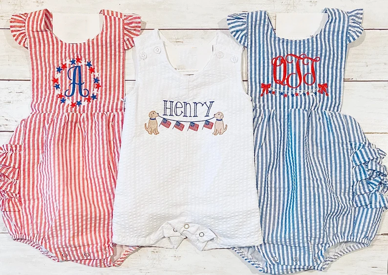 Newborn Baby Romper 4th of July Embroidery Baby Girl Romper Summer Sunsuits Seersucker Bbay Clothes Sets