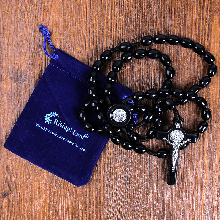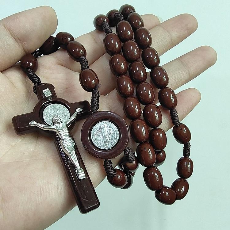 Newest Acrylic Oval Beaded Brown Thread Knotted Catholic Rosary With the Miracle of Alloy St Benedict