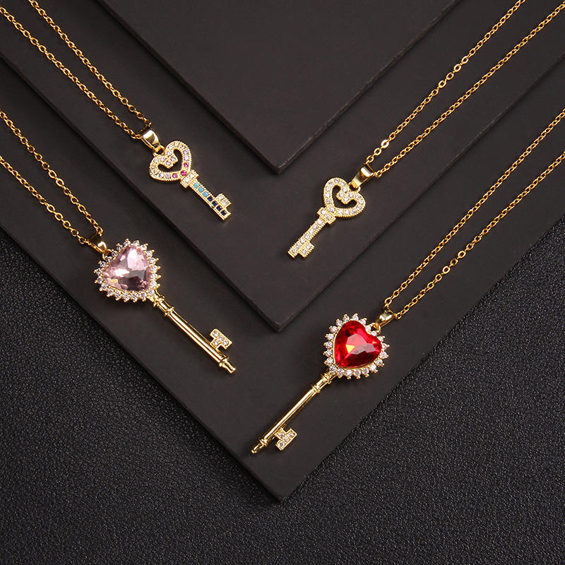 Newest Colorful Zircon Love Heart Four Leaf Clover Pendant Necklace Gold Plated Crystal Key Shaped Necklace