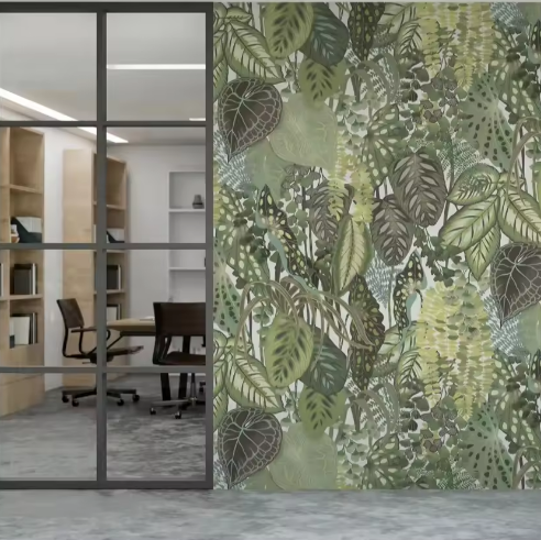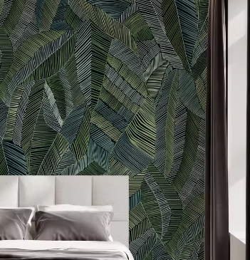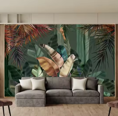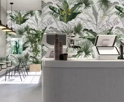 Carta da Parati Murale 3D con Foglie Verdi Tropicali, Design Innovativo per Decorazione di Ristoranti e Caffetterie