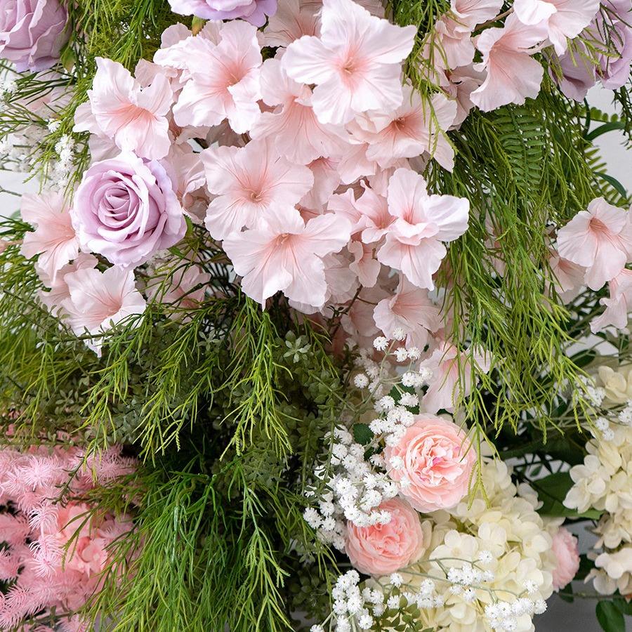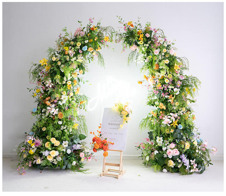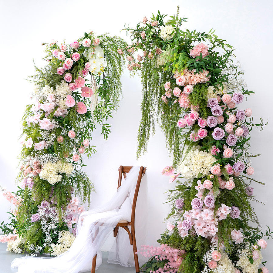 Più recente disegno popolare rosa artificiale corno arco fila con verde per la decorazione di scena di sfondo di nozze