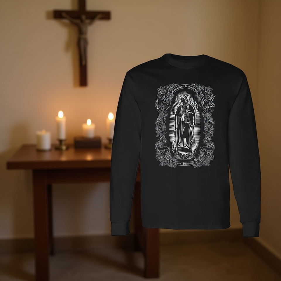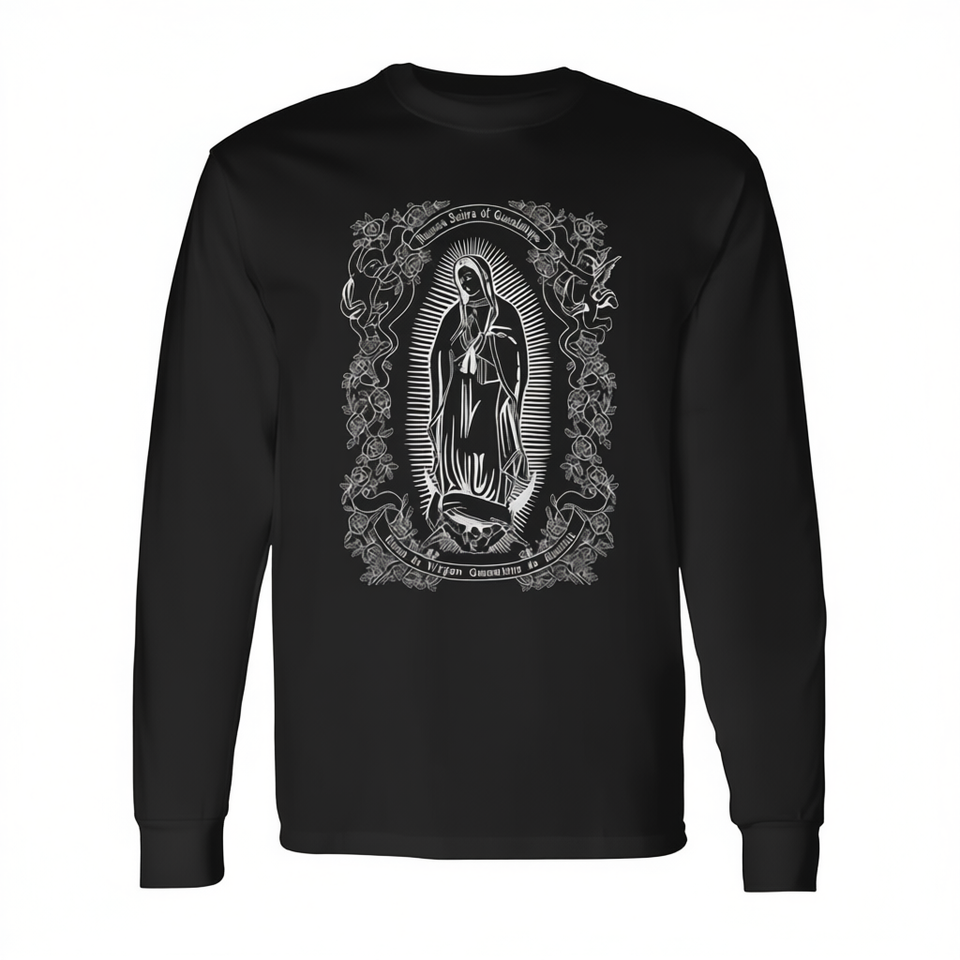 Elegante T-Shirt Cristiana a Maniche Lunghe con Madonna di Guadalupe per Uso Promozionale