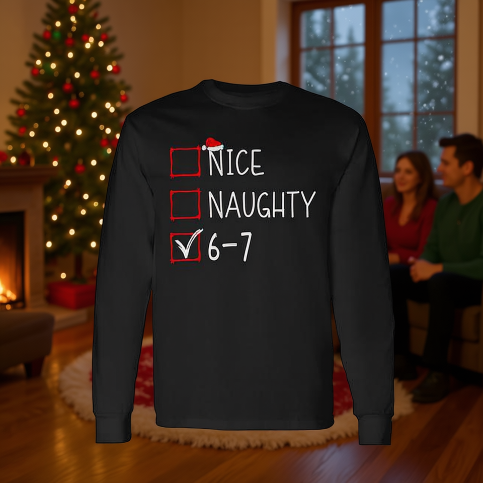 Maglietta a Maniche Lunghe con Memes Natalizi 'Nice Naughty 6-7', Divertente Abbigliamento Festivo per Adulti, Camicia per Riunioni Familiari Invernali