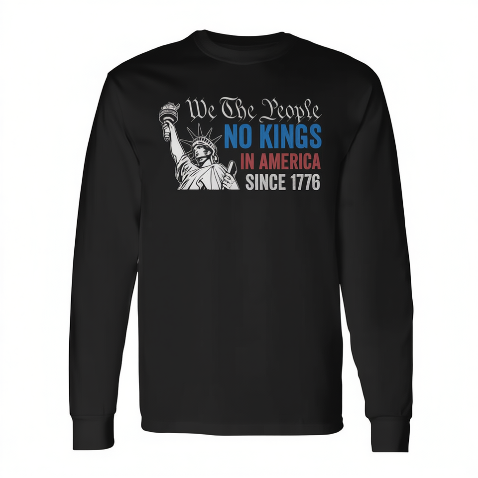 No Kings In America Since 1776 T-shirt a maniche lunghe con design della statua We The People nera