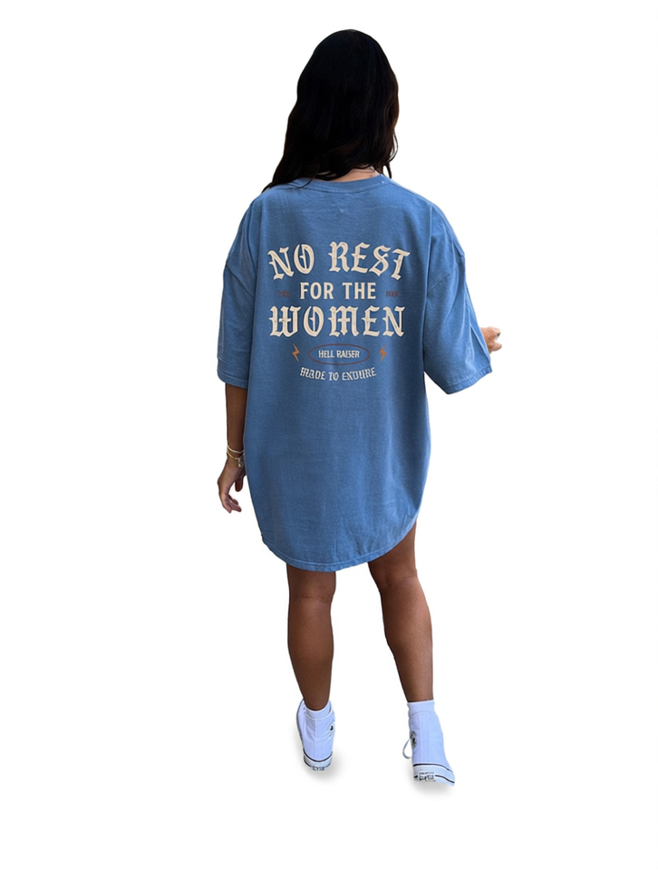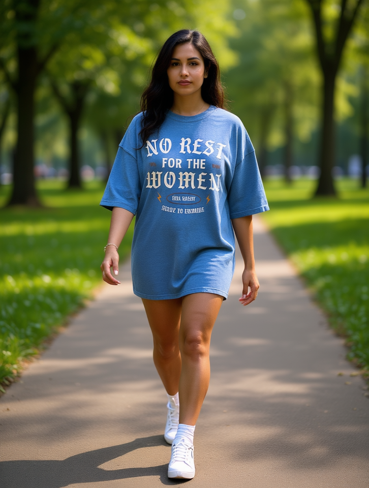 T-shirt da donna No Rest For The Women, modello femminista, a maniche lunghe, girocollo, 100% cotone jersey, stampa logo sul retro, taglie forti.