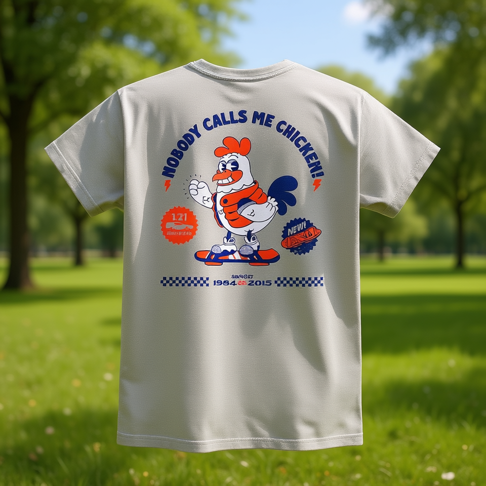 Maglietta Nobody Calls Me Chicken grigia 1984 2015 con stampa sul retro, maglietta promozionale