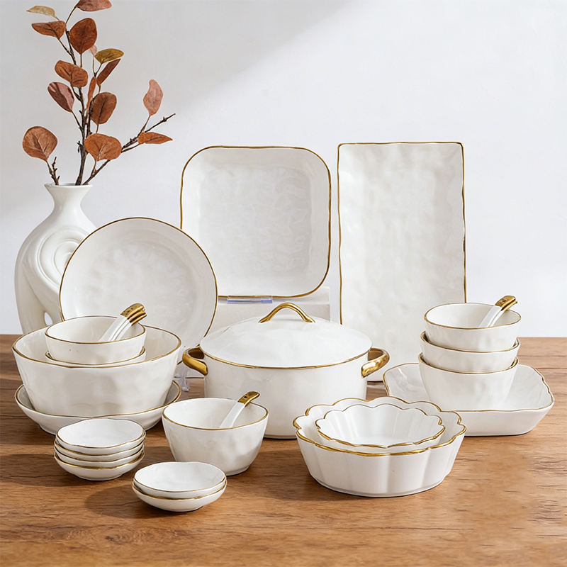 CHAOZHOU QIANYUE Set piatti e ciotole in porcellana con bordo oro, stile nordico, lusso e alta qualità