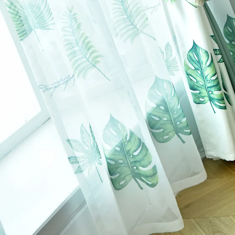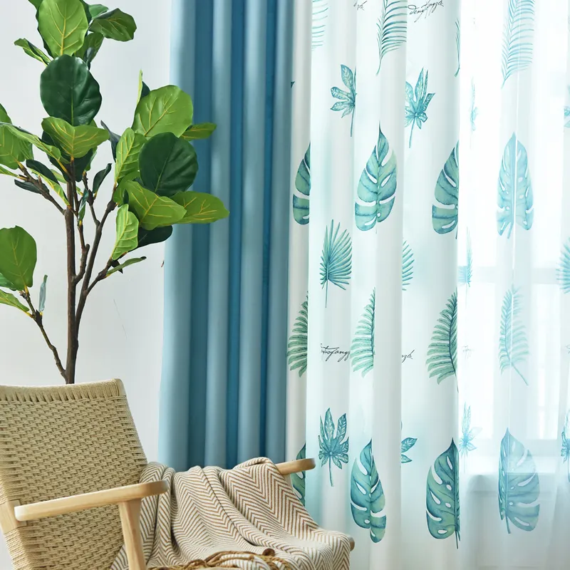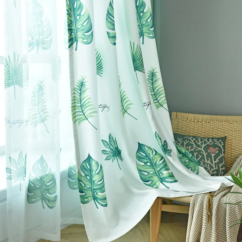 Nordic Style Plant Big Leaf Pattern Printed Curtains, Modern Blackout Living Room Bedroom Stitching Design Curtains