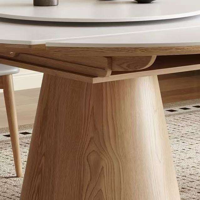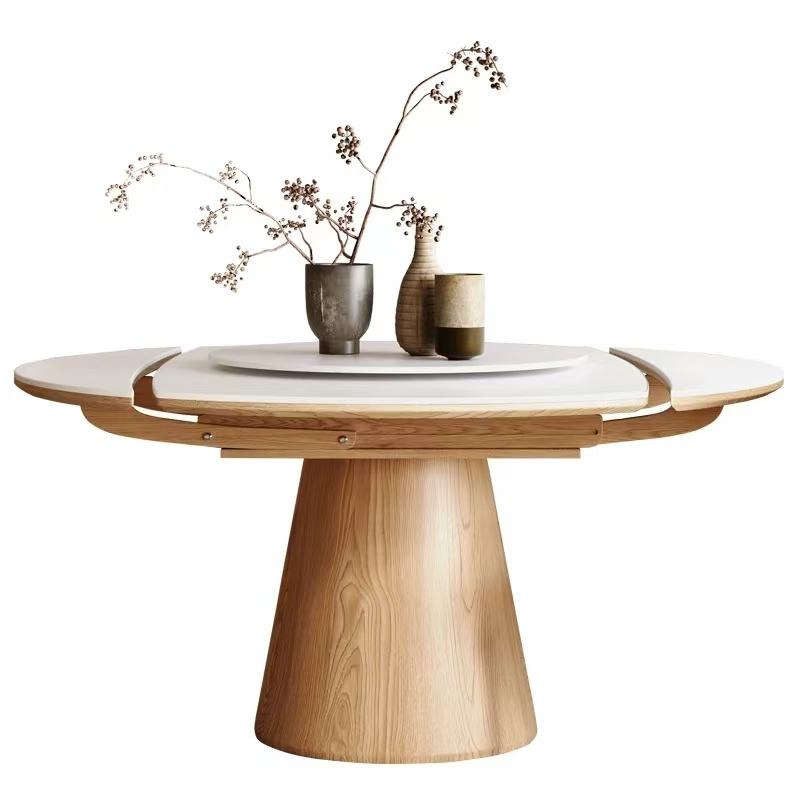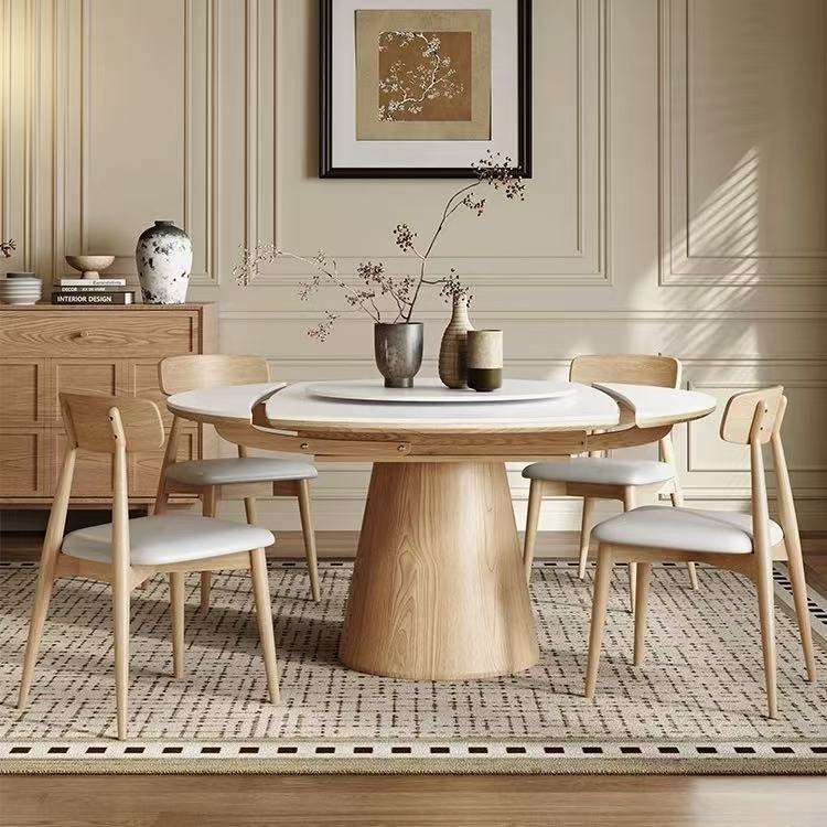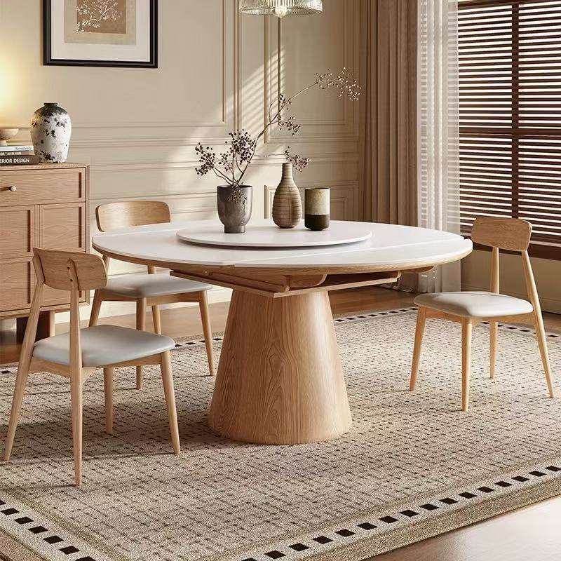 Set Tavolo da Pranzo Allungabile e Pieghevole da Quadrato a Rotondo per 6 Persone in Stile Nordico Semplice con Piano in Lastra di Roccia Bianca e Base in Legno Massello di Noce