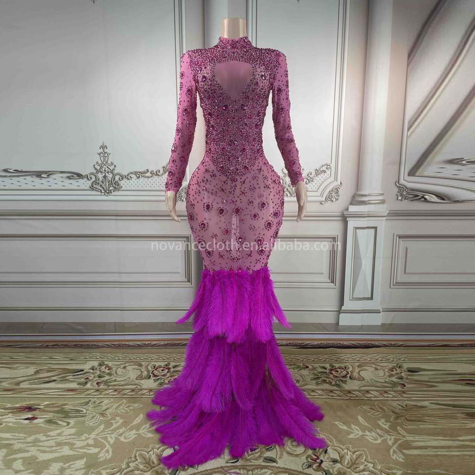 Novance Dresses Women Classic Black New Fashion Long Dress Women Partying Shiny Diamond Rhinestone Feather Tailing Evening Dress