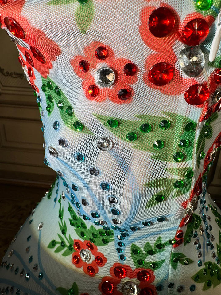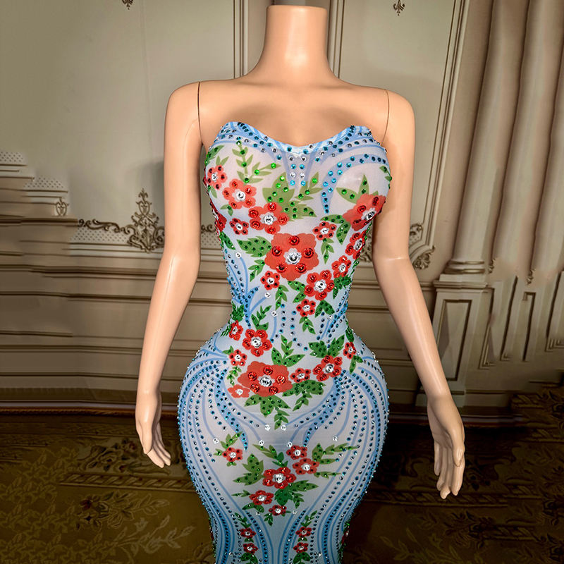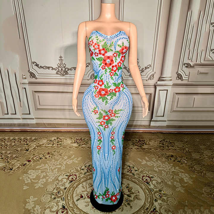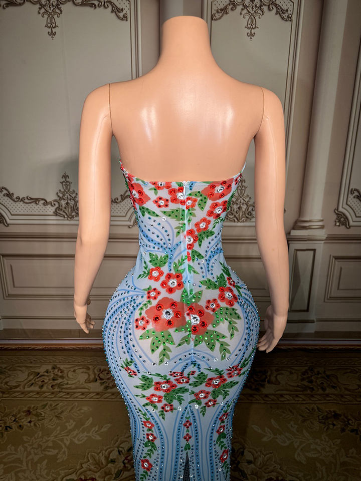 Novance Y5001 abito da sera da donna lungo elegante con strass con stampa floreale blu senza spalline abito di compleanno di lusso