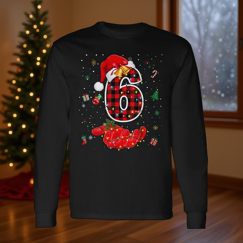Maglietta a maniche lunghe natalizia a quadri rossi numero 6 con design di cappello da Babbo Natale e luci per abbigliamento natalizio