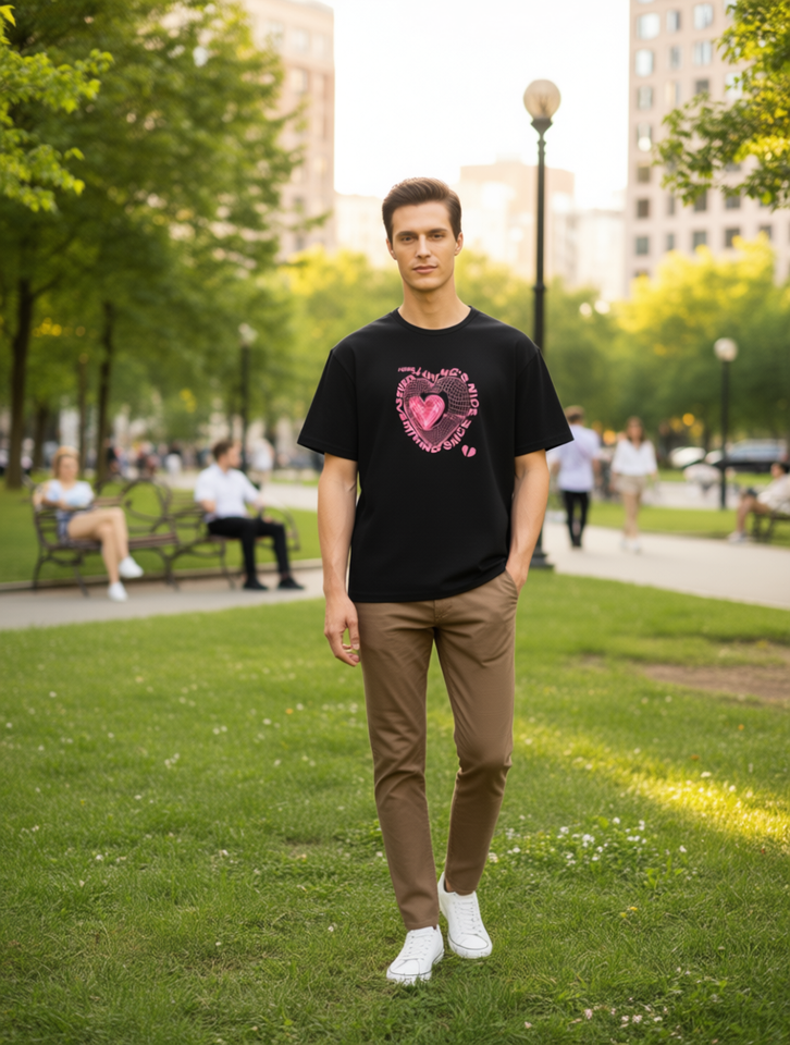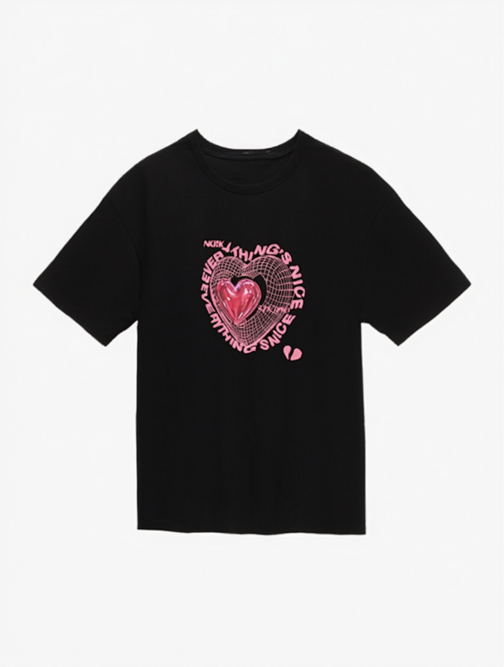 T-shirt nera da donna Nurk, vestibilità slim, manica corta, in jersey di cotone, stampa cuore rosa, girocollo, casual, per tutte le stagioni, lavabile in lavatrice