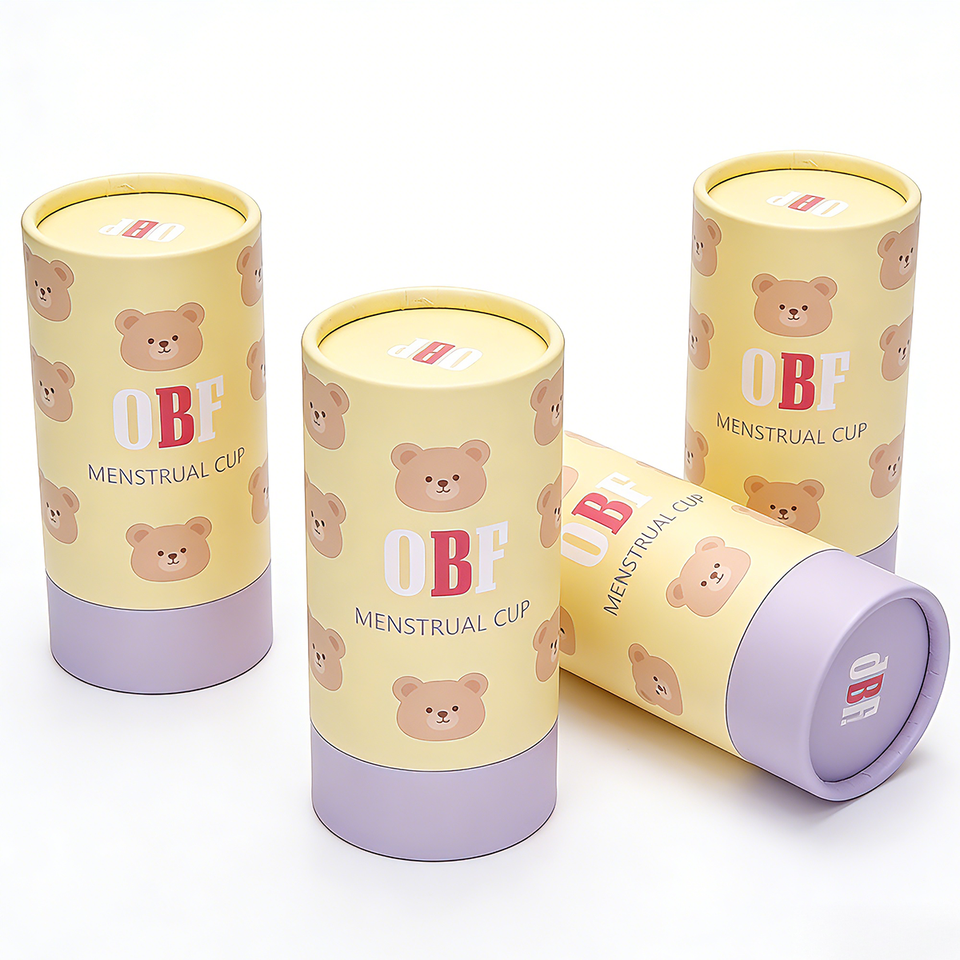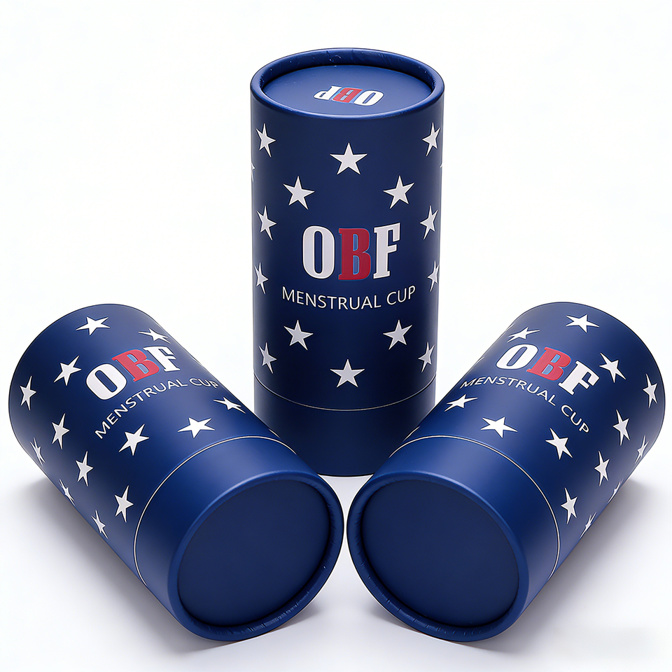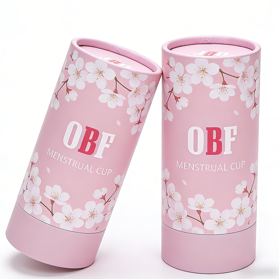 Scatola per Coppetta Mestruale Cilindrica Personalizzata con Logo OBF, in Materiali Riciclati, Monouso/Riutilizzabile, Colore Personalizzabile