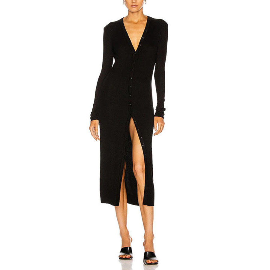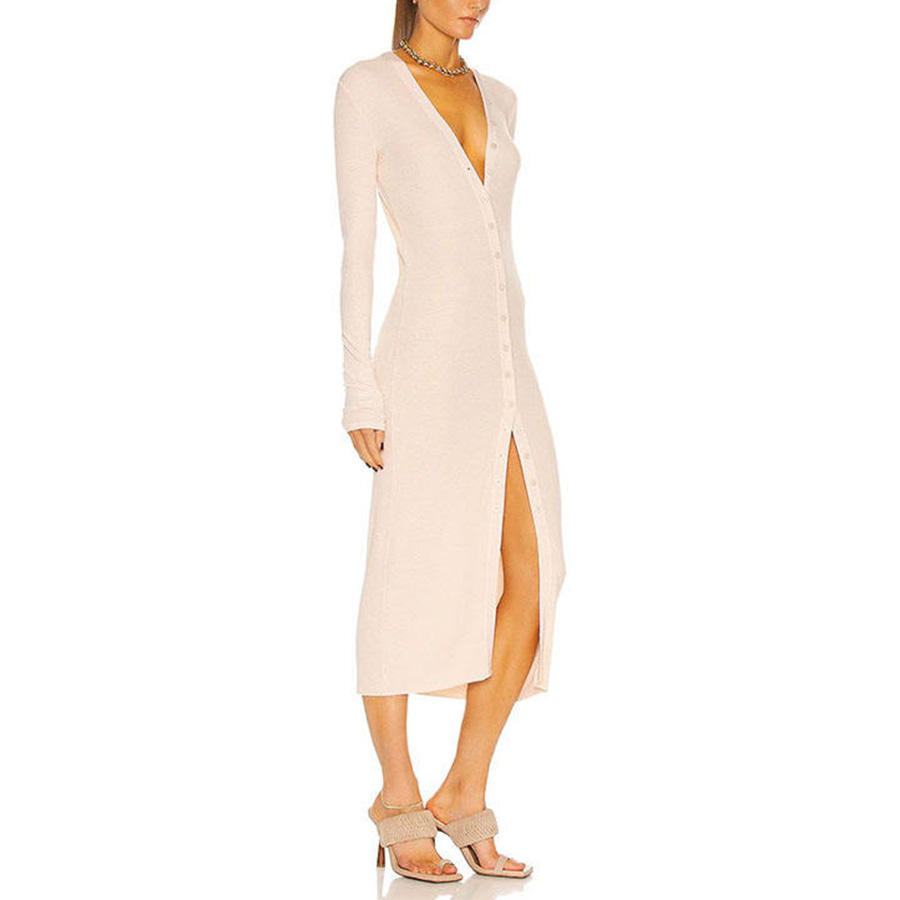 OEM 2025 Women Winter Solid Breathable Button Casual Midi Custom V Neck Bodycon Natural Waist Ribbed Jersey Dress
