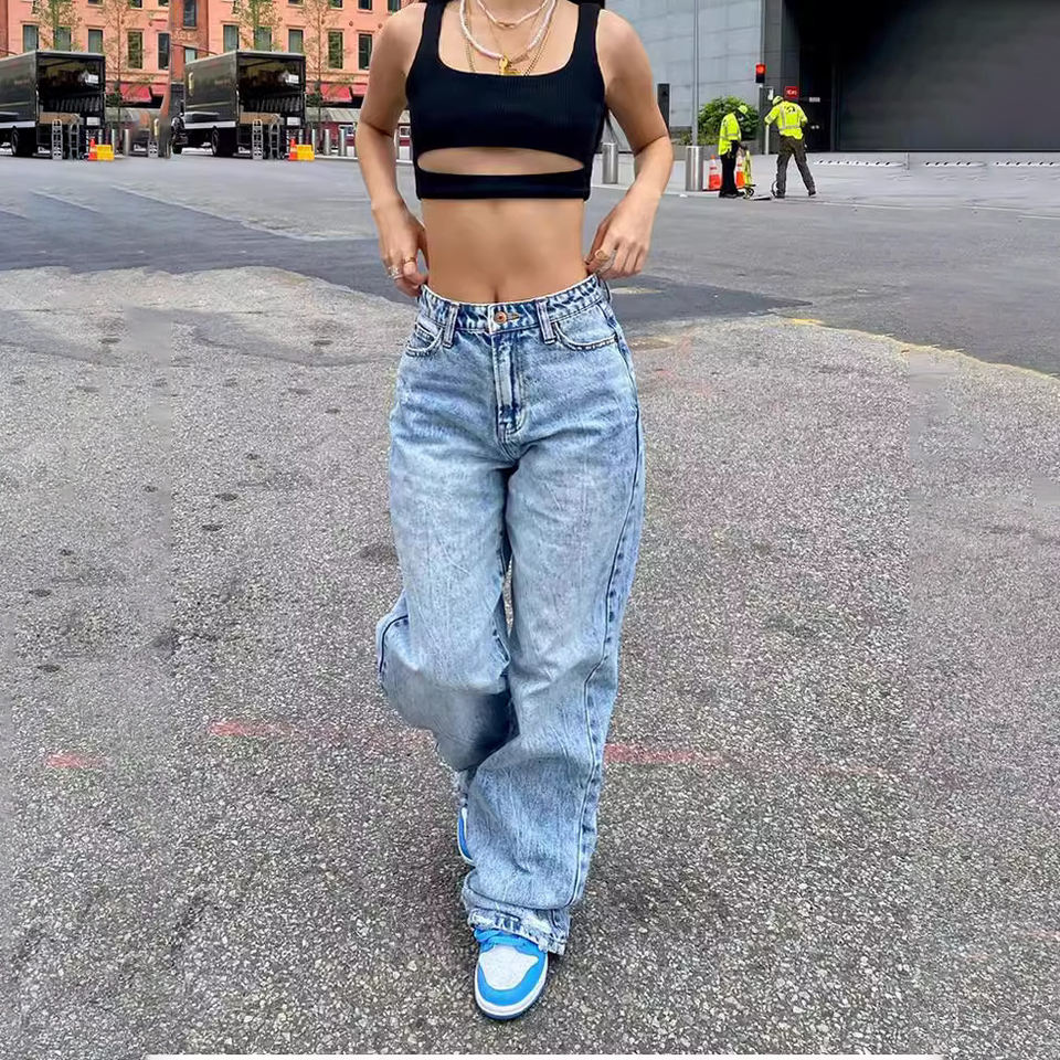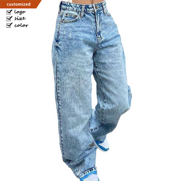 OEM Blue High Waist Trousers Ladies Casual Wide Leg Pants High Quality Elegant Straight Women Jeans for Girl