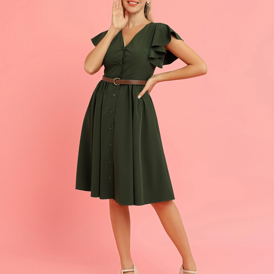 OEM Button-Up With Belt V-Neck Elastic Waist Women'S Vintage Dresses Retro 1950S 60S Short Sleeve