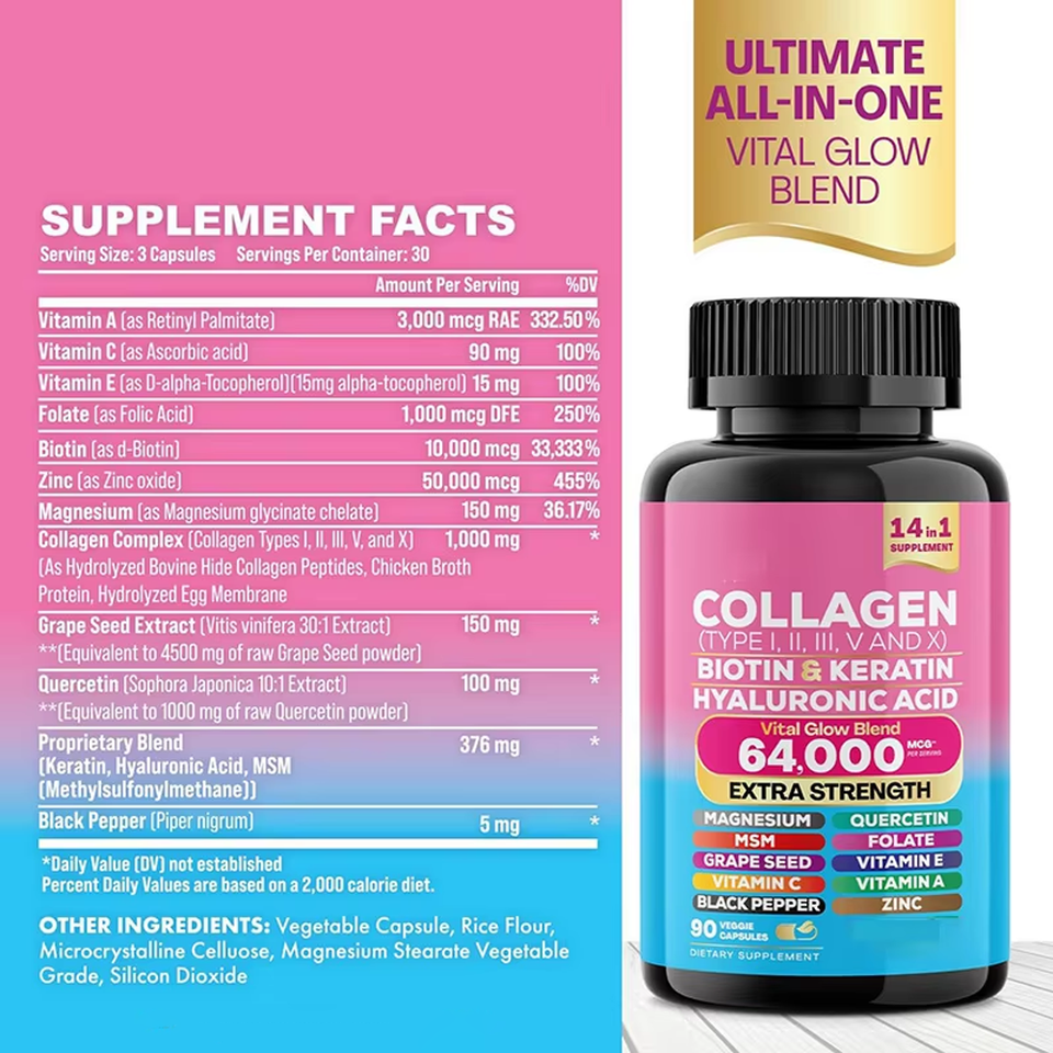 Capsule di Collagene OEM 90 Pezzi, Supporto per Capelli, Unghie e Articolazioni, 64000mcg Vital Glow Blend per Uomini, Integratore 14-in-1 con Biotina