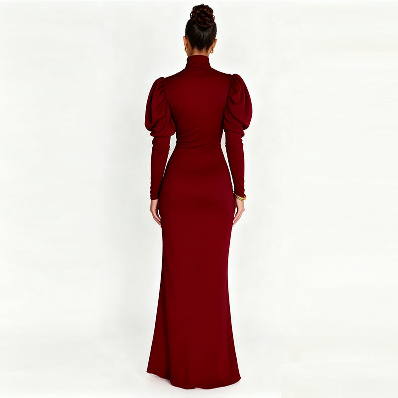 Abito Lungo Vintage in Maglia a Collo Alto Personalizzato OEM, Autunno Inverno, Bordeaux, Maniche Lunghe a Sbuffo, con Spacco, Sexy e Aderente per Donne