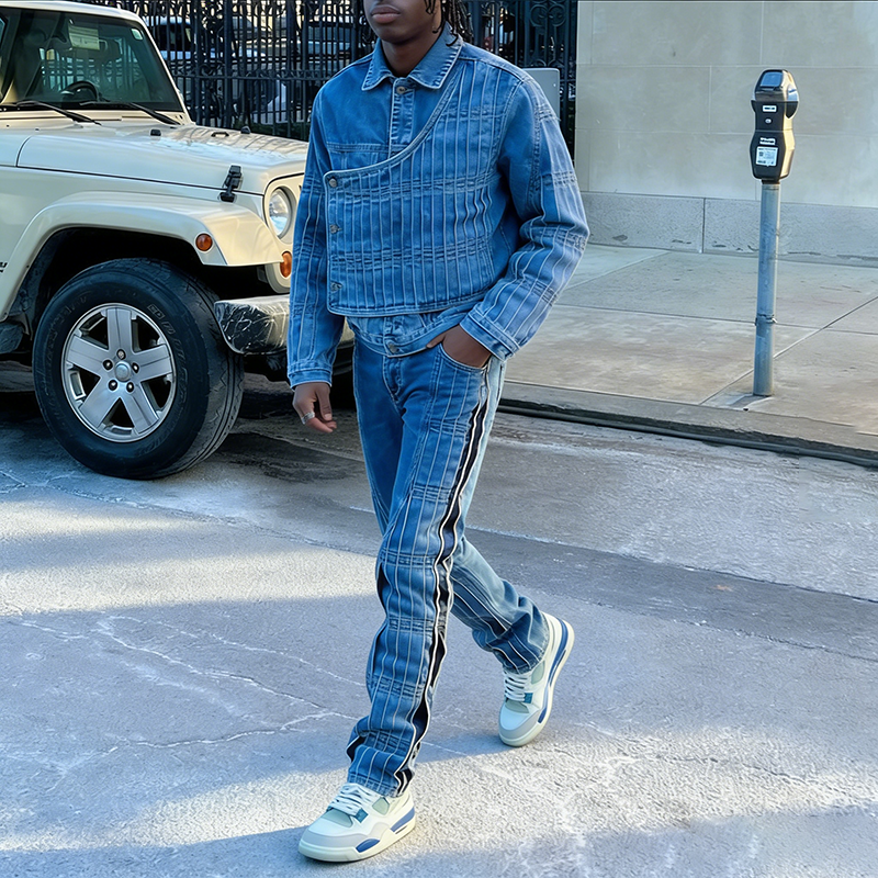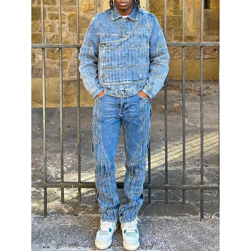 OEM Custom Fashion High Quality Denim Jacket Set Tracksuit Streetwear Slim Fit Two Piece Washed Jeans Sets for Men