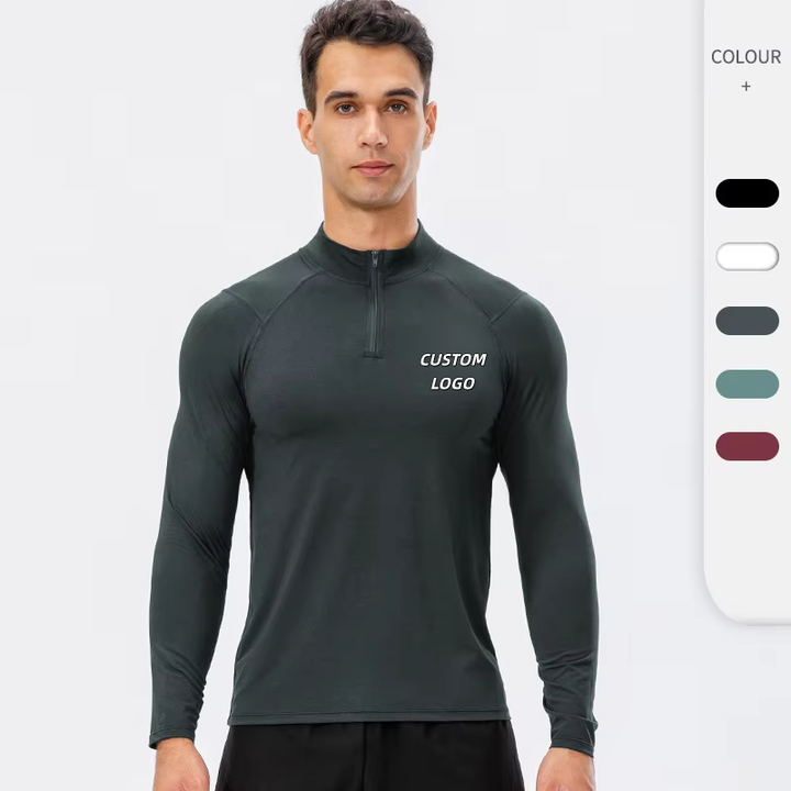 Maglia Sportiva da Uomo con Zip a un Quarto e Maniche Lunghe, Personalizzabile con Logo OEM, 180GSM, Asciugatura Rapida, Vestibilità Slim, per Corsa, Palestra e Fitness, Vendita all'Ingrosso