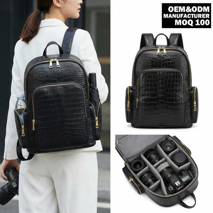 Zaino per Fotocamera DSLR/Mirrorless Professionale OEM Personalizzato in Pelle Vegana PU Nera Effetto Alligatore/Coccodrillo per Fotografi