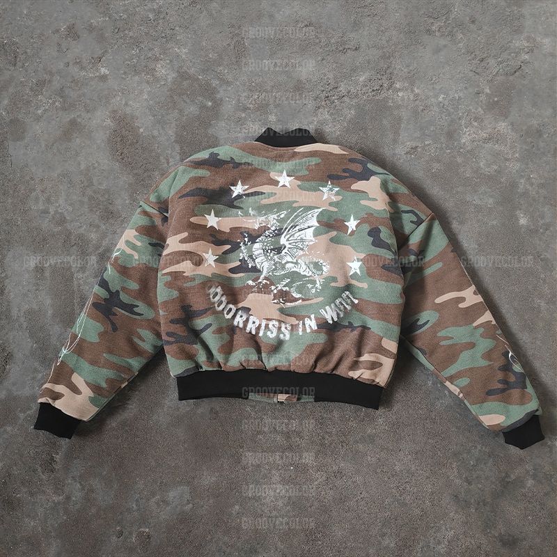 OEM Factory Streetwear Custom Acid Wash Cotton Twill Duck Canvas Camo Jacket Cropped Bomber Flight Camouflage Denim Jacket Men