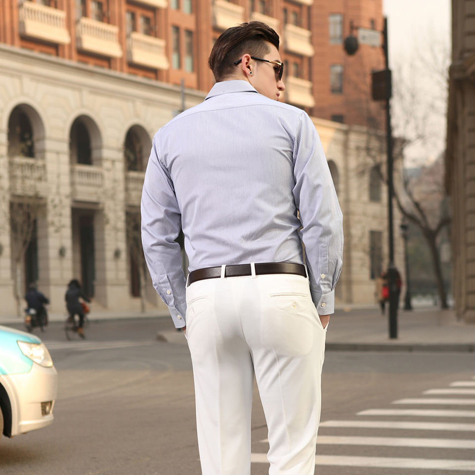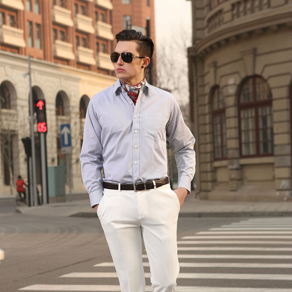 OEM di fabbrica del commercio all'ingrosso di marca bianco blu a righe 100% cotone camicia da uomo