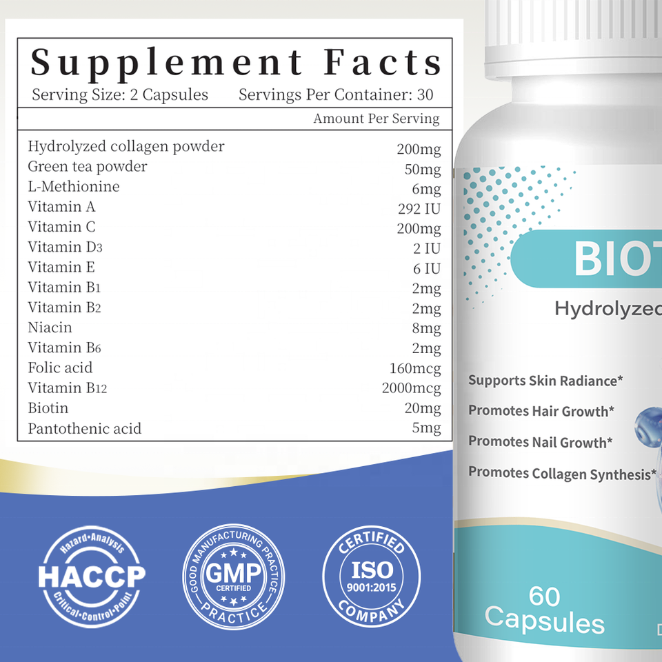 Capsule OEM 15 in 1 con Collagene Idrolizzato, Biotina, Tè Verde in Polvere, L-Metionina, Vitamina B12, Niacina, Vitamina C