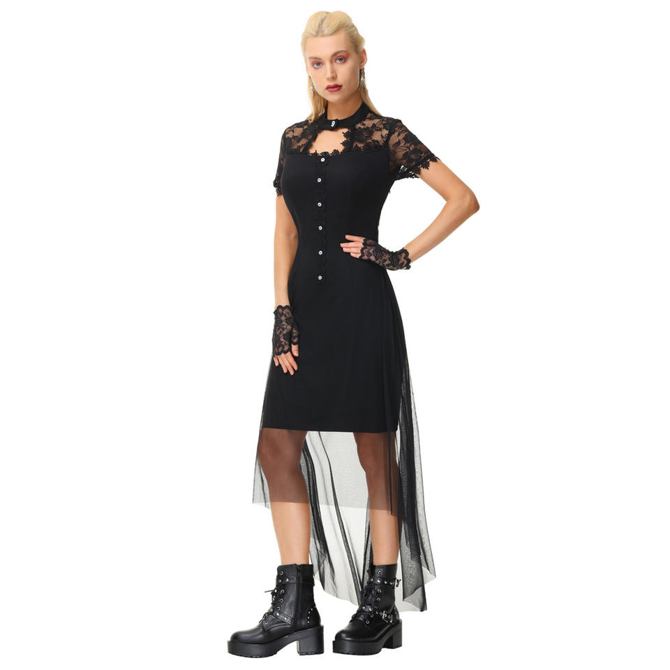 OEM Ladies Short Sleeve See Through Tulle Netting Overlay Women Vintage Retro Black High Low Dress