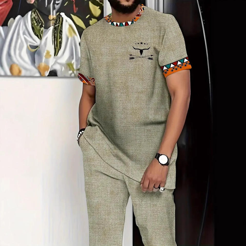 OEM Men's Retro Trendy Summer Print Color Blocking Cotton Breathable Plus Size Knitted Clothing Long Sleeve Casual Walking Suit