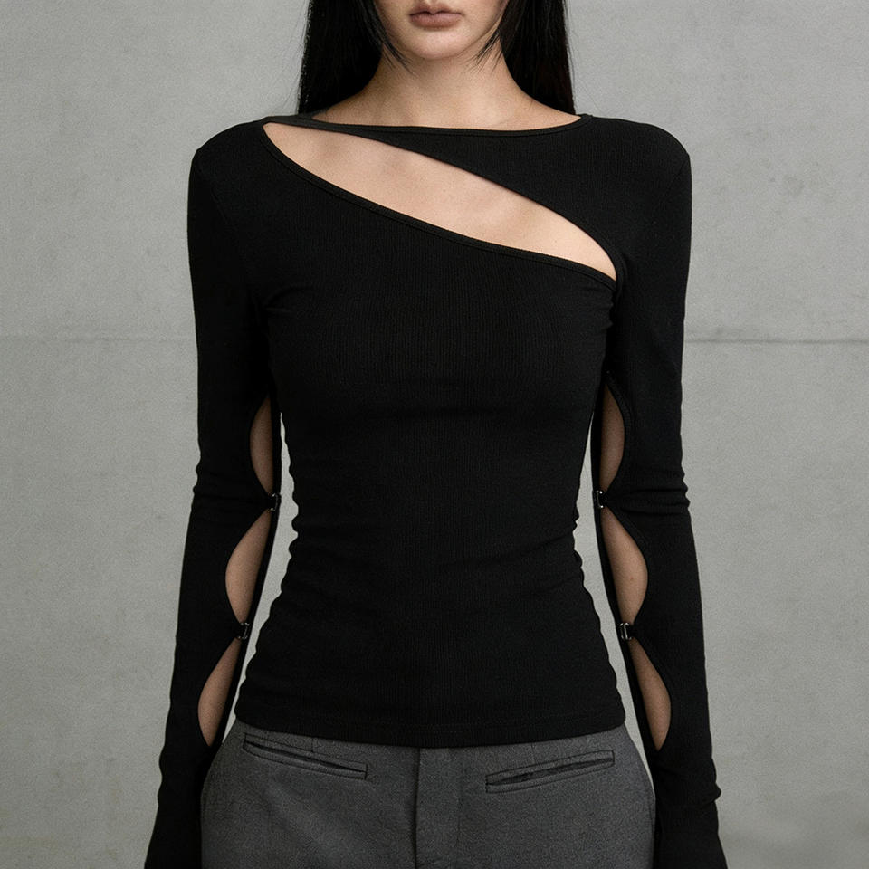 T-shirt a maniche lunghe da donna, stile street, elegante e alla moda, con design traforato, semplice ed elegante, nera, modello irregolare, OEM ODM.