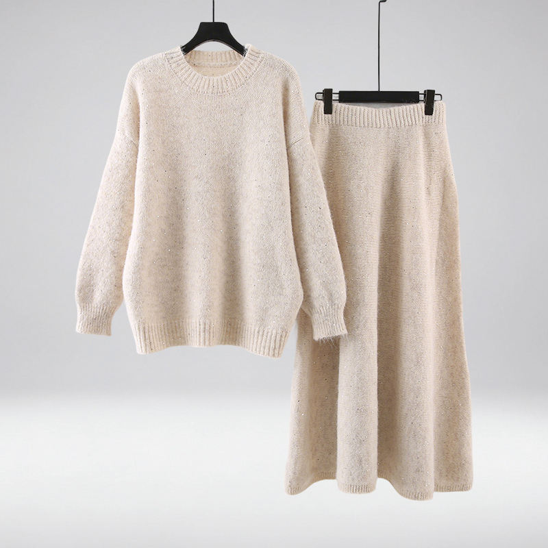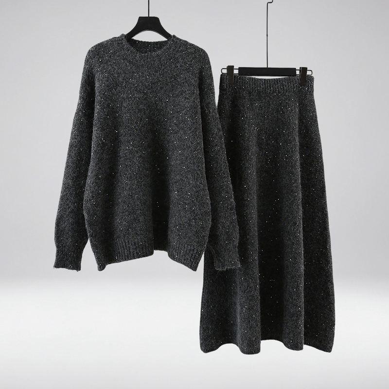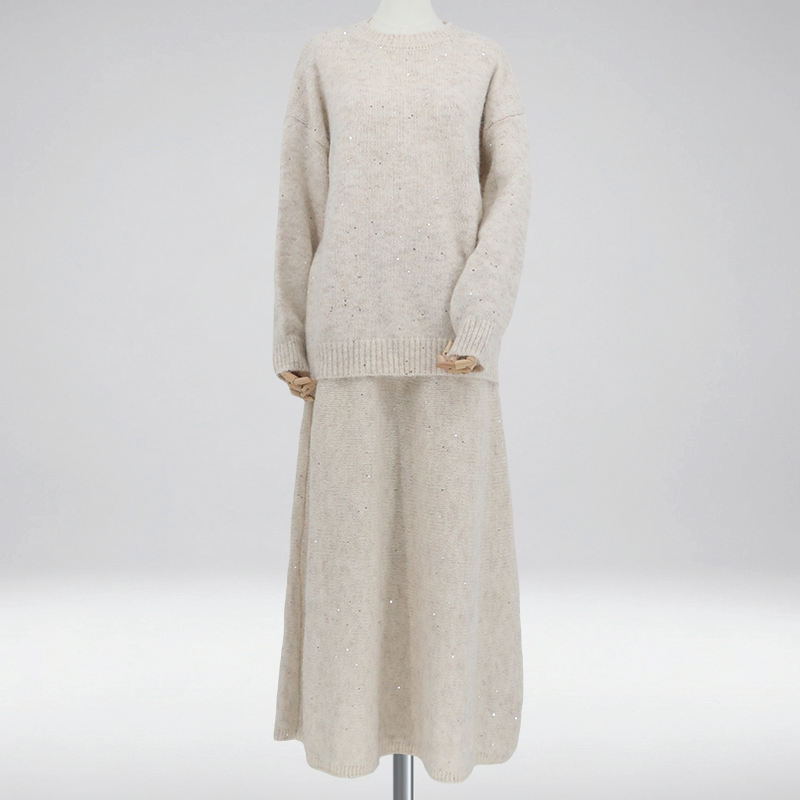 Set Maglione Pullover e Gonna con Paillettes Personalizzato OEM ODM all'Ingrosso Completo Donna in Maglia Glitterata a Due Pezzi