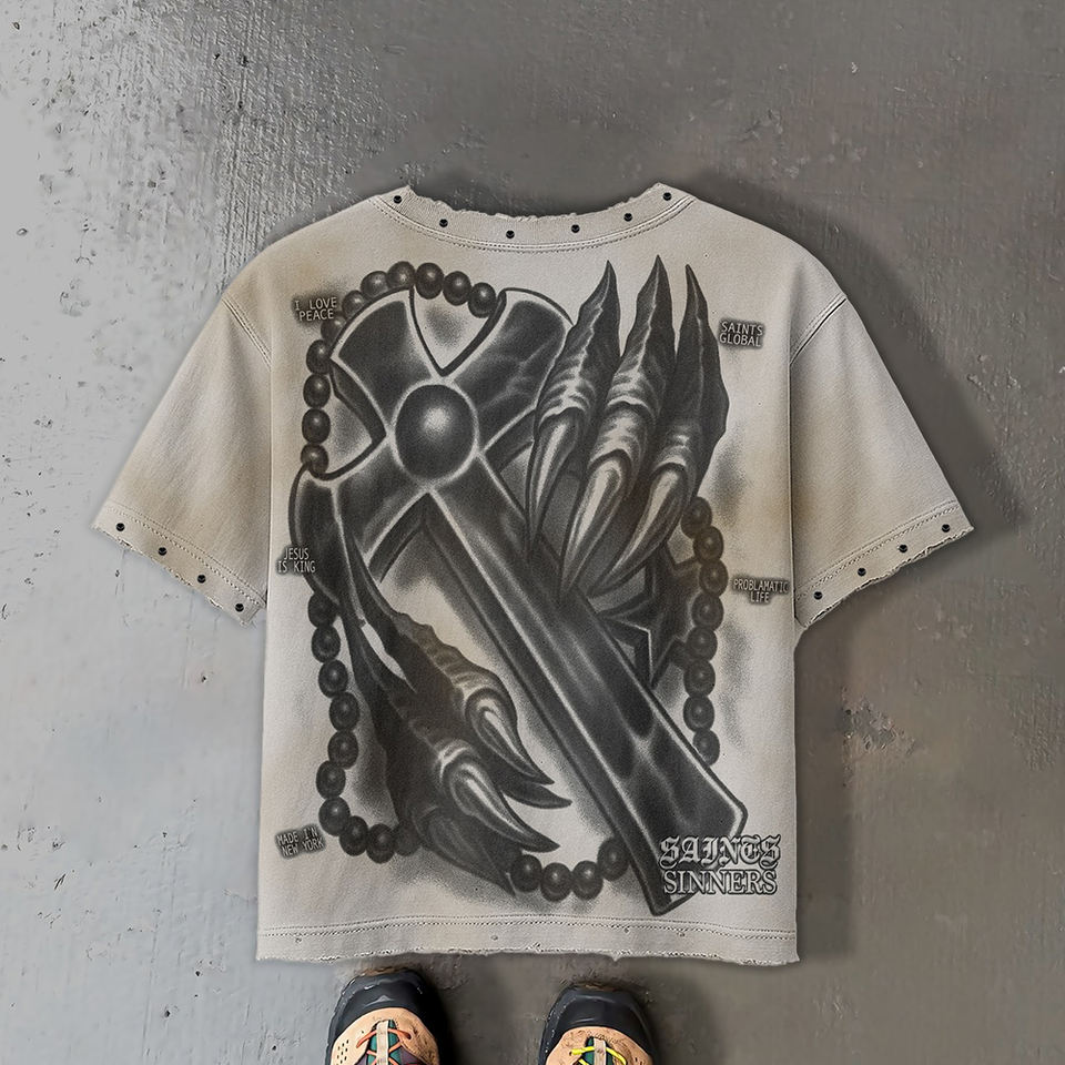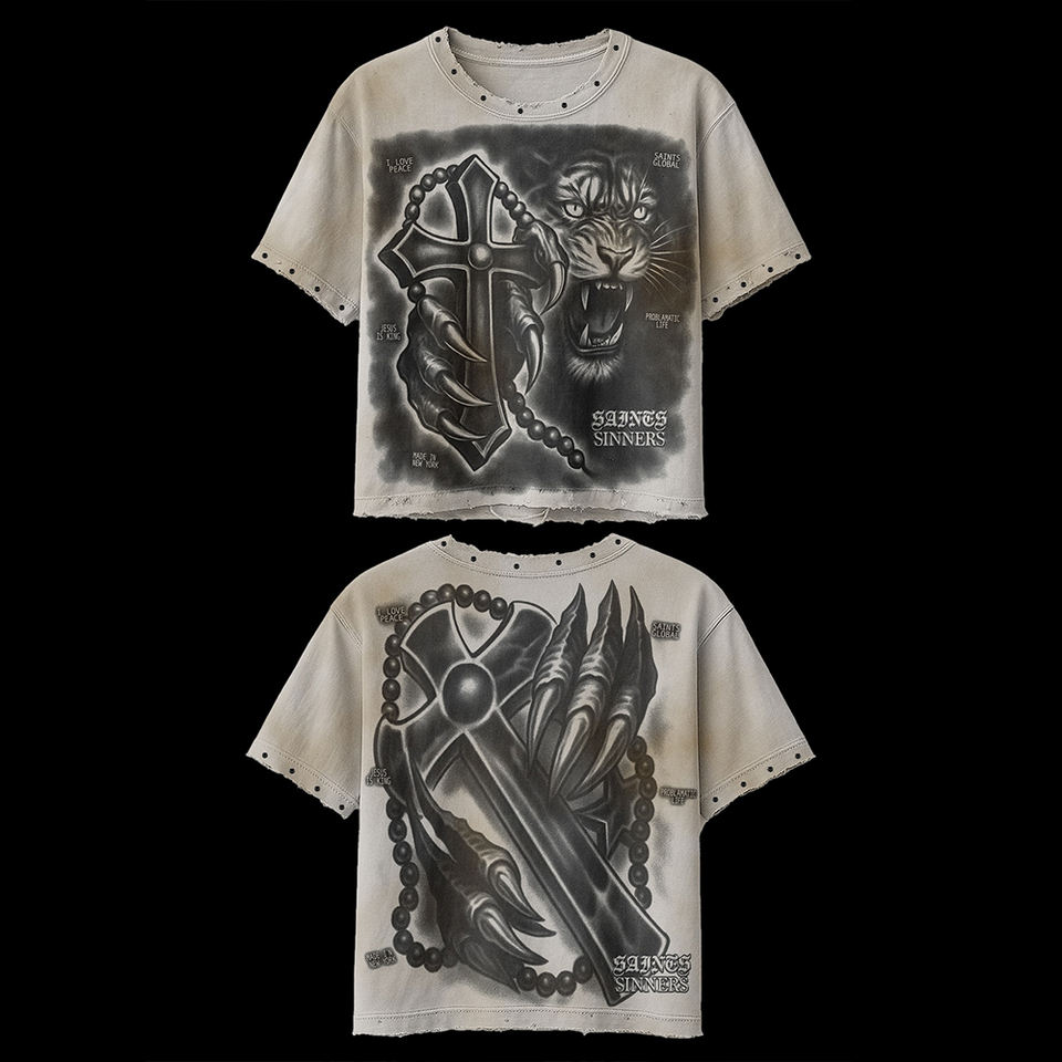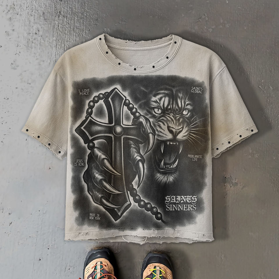 T-shirt da uomo personalizzata OEM ODM oversize, taglio corto, lavaggio acido, 100% cotone, stampa grafica tigre e croce, effetto distressed e sfilacciato, stile grunge Y2K