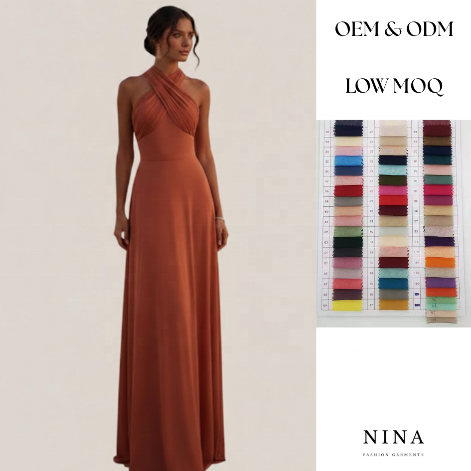 Servizio OEM ODM per Abito Lungo in Chiffon Arancione 100% Poliestere con Spalline Incrociate e Linea ad A per Abiti da Sera e Cerimonie