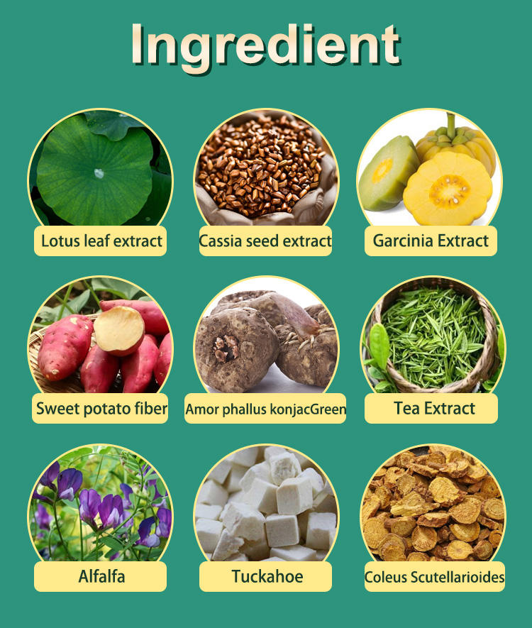 Estratto di foglie di loto, estratto di semi di Cassia, estratto di Garcinia, fibra di patata dolce, Amor phallus konjacGreen, estratto di tè, erba medica, Tuckahoe, Coleus Scutellarioides