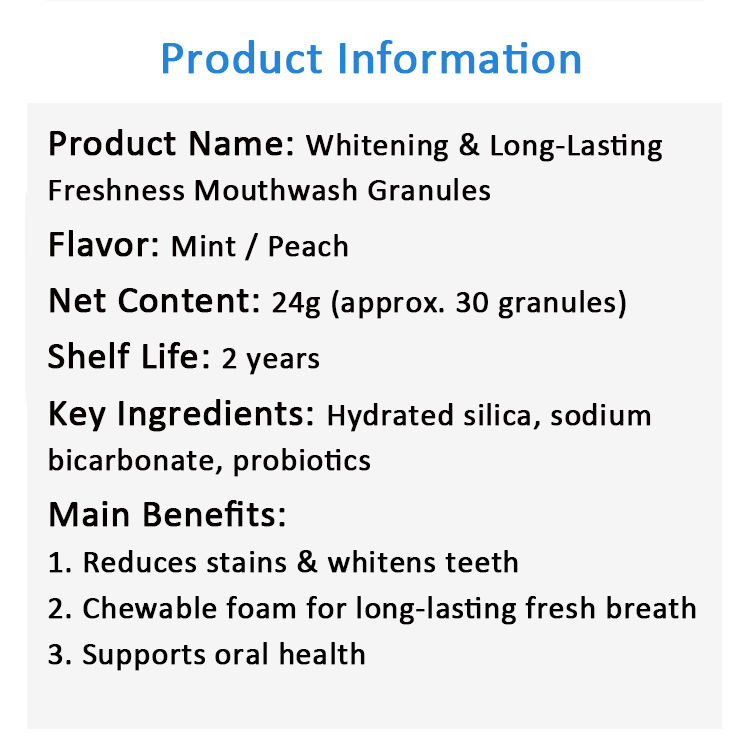 Funzione:Sbiancamento, alito fresco, ridurre le macchie, pulizia orale