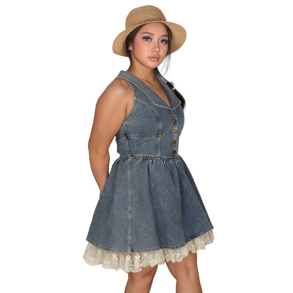Servizio OEM Abito Corto Estivo da Donna in Denim con Colletto, Senza Maniche, Cintura in Vita, Monopetto, Mini Abito a Linea A
