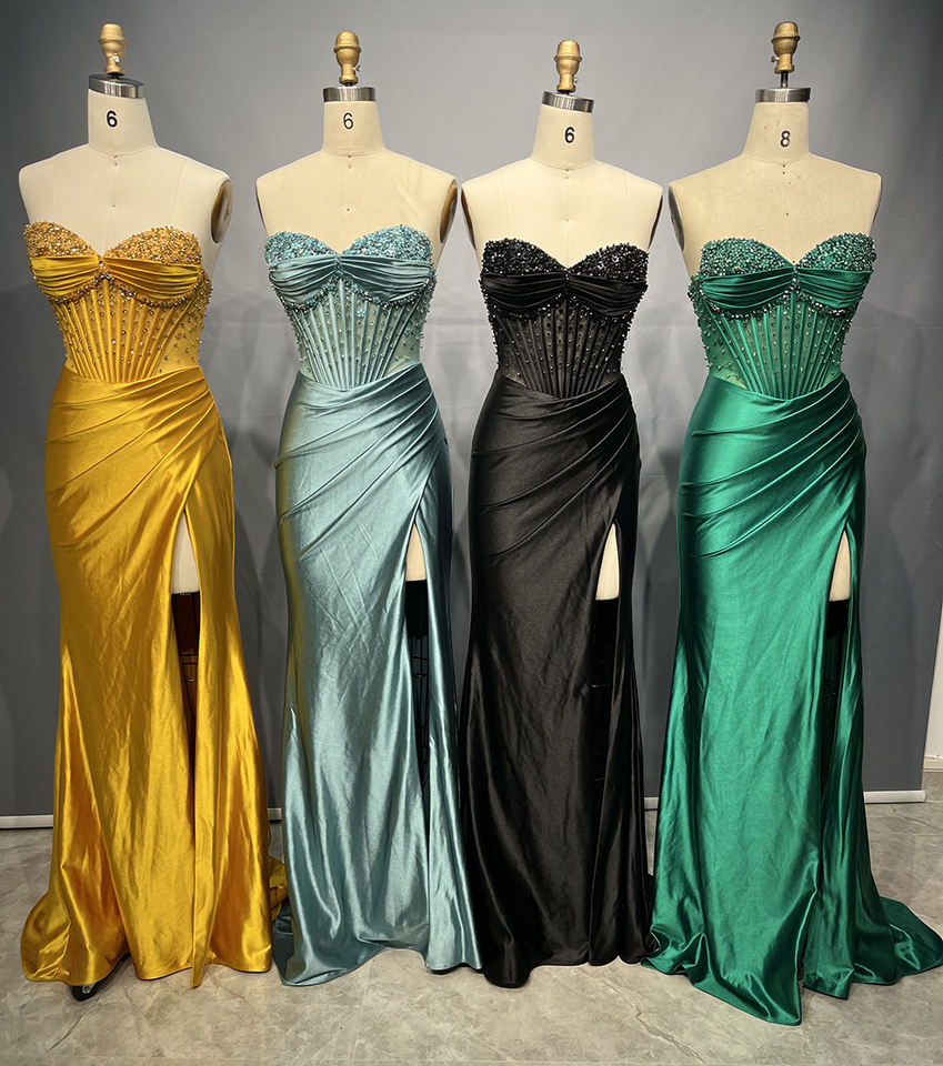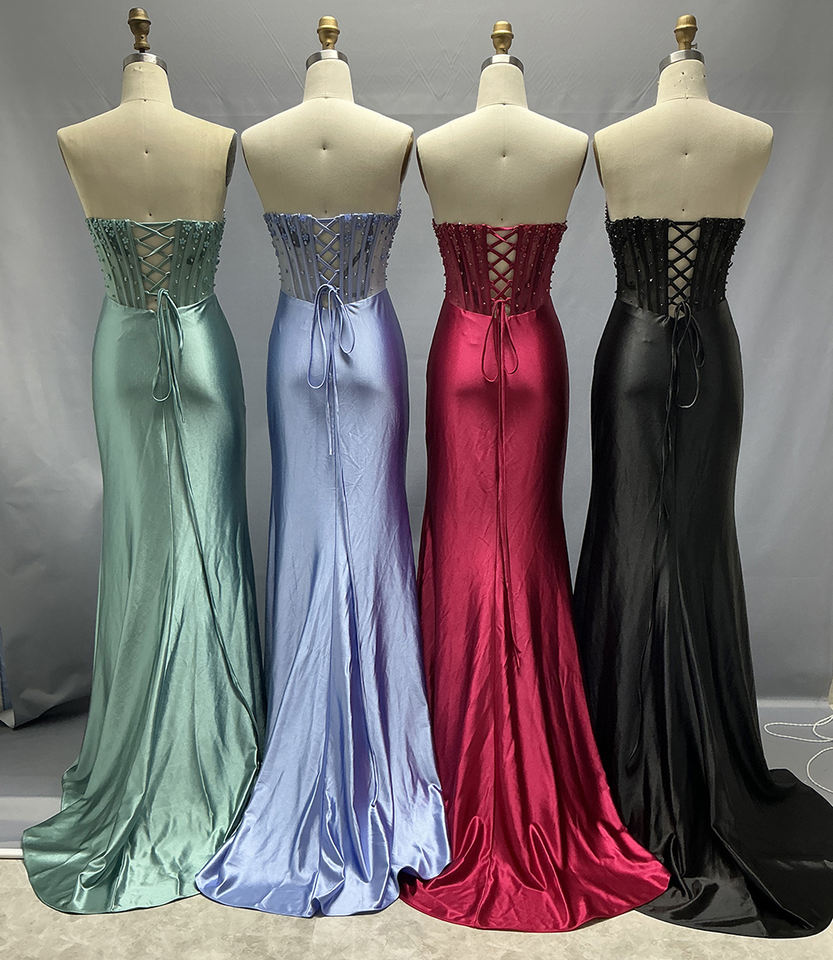 Abiti da Sera OEM Eleganti da Donna per il Ballo di Fine Anno in Raso Plissettato con Corsetto in Tulle Trasparente, Schiena con Lacci, Spacco e Strass