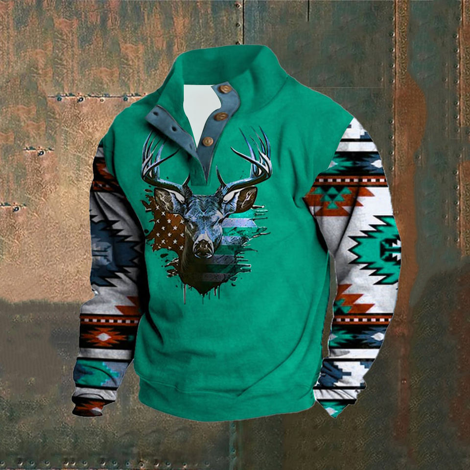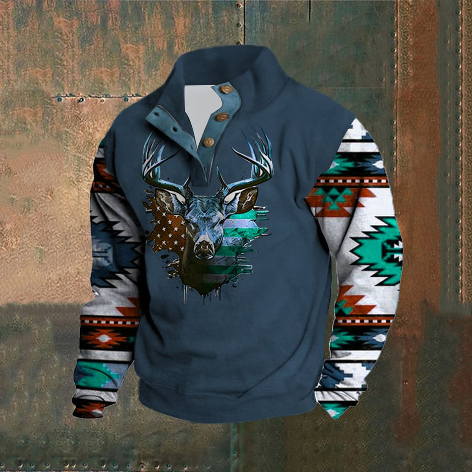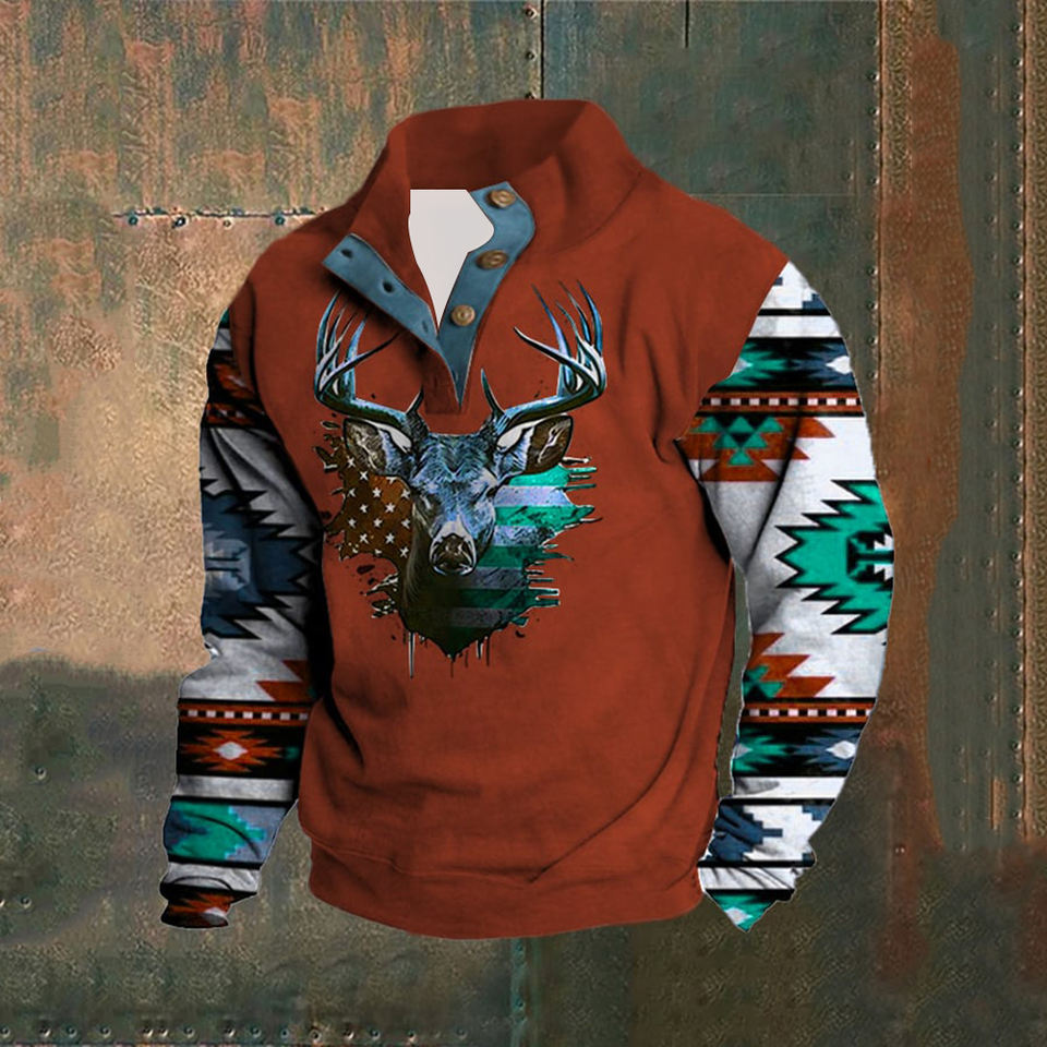 OEM felpa con cappuccio a sublimazione in stile occidentale con collo alto con bottoni Patchwork felpa Pullover da uomo