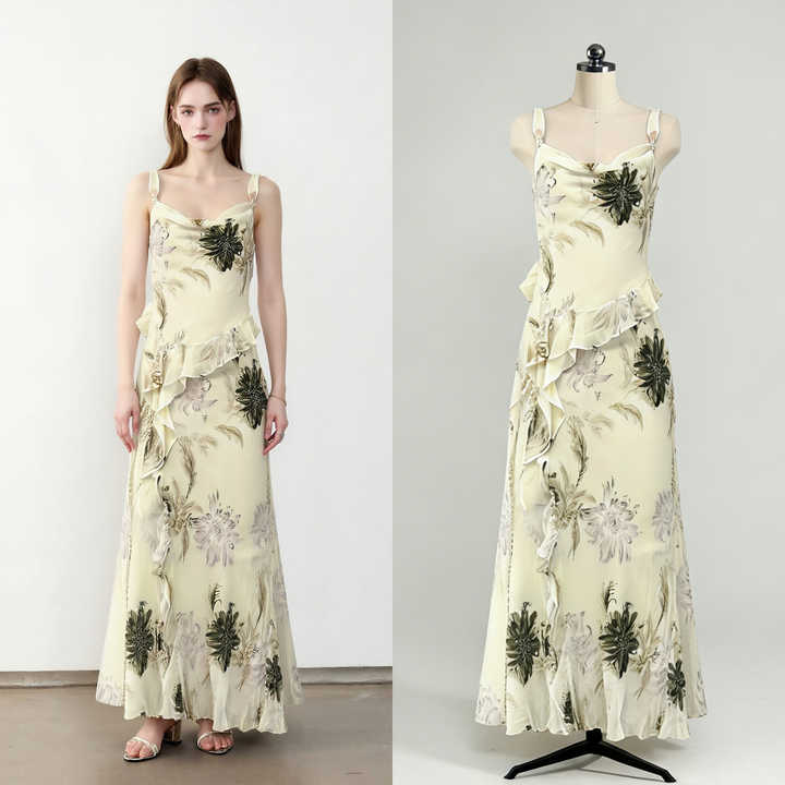 Elemento di moda:Floral Print / Ruffles / Spaghetti Strap