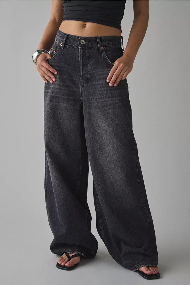 OEM Jeans cropped vita alta, taglio largo, denim rigido stone wash nero, traspirante, ecologico, vintage, ingrosso personalizzabile