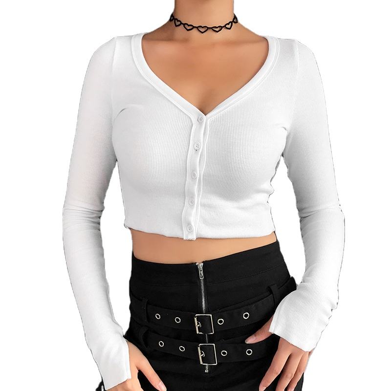 OEM Women's Casual Rib Knit Fitted Workout Yoga Shirts Long Sleeve V-Neck Button Crop Tops with Print Pattern Ladies T-Shirts