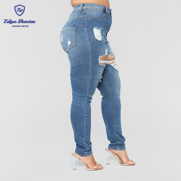 OEM e ODM Jeans Skinny strappati blu medio da donna pantaloni stretti