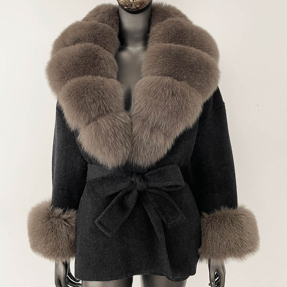 Giacca Invernale OFTBUY con Cintura e Tasche in Vera Pelliccia di Volpe Naturale Misto Lana Morbida Cappotto di Lusso da Donna in Lana e Cashmere