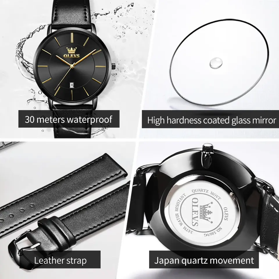 OLEVS 5869 High Quality Black Mens Quartz Watch Luxe Leather Strap Big Dial Date Display Ultra Thin Unique Business Wrist Watch